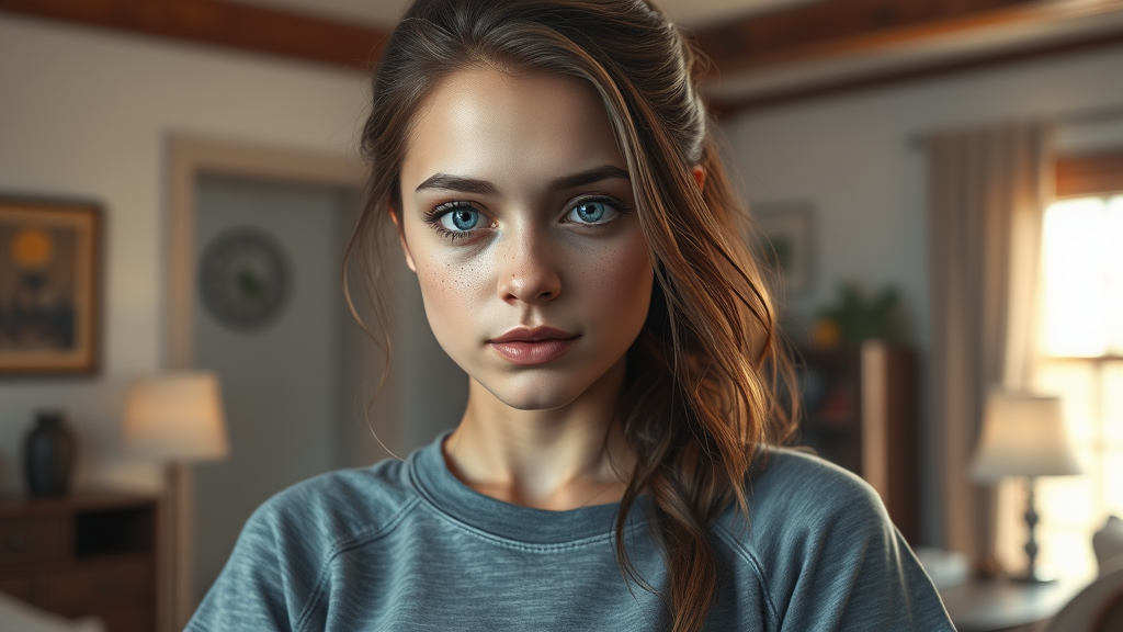 pretty girl in a gray workout shirt, cinematic setting, detailed freckles, muted color palette, interior environment, intricate features, avoiding negative aspects such as poorly drawn elements, incorrect anatomy, and unwanted mutations, focus on clarity and aesthetics