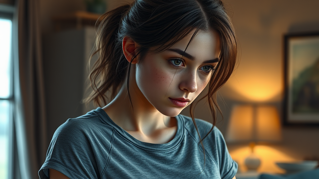 pretty girl in a grey workout shirt, intricate details, cinematic, interior setting, detailed with muted colors, freckles, avoid poorly drawn elements, avoid bad or wrong anatomy, maintain correct limb count, ensure connected limbs, no mutations or ugly features, avoid blurriness, no amputations.