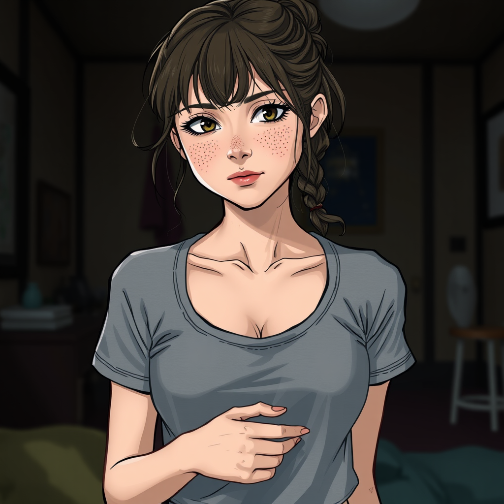 Pretty girl in a grey workout shirt, intricate details, cinematic, interior setting, detailed, muted colors, freckles, avoiding poorly drawn elements, maintaining correct anatomy, ensuring all limbs are proportionate and connected, avoiding mutations or distortions, keeping the appearance attractive and clear without blurriness or imperfections.