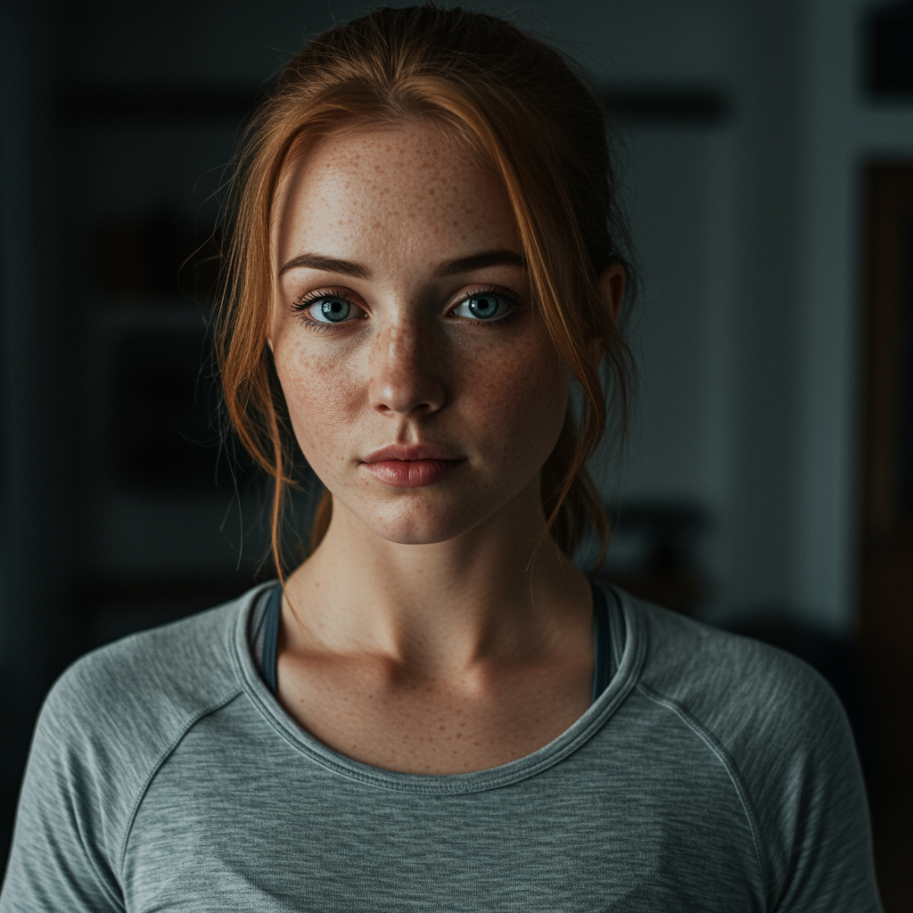 pretty girl in a grey workout shirt, intricate details, cinematic interior, detailed, muted colors, freckles, emphasis on smooth and accurate anatomy, natural and realistic features, clear and sharp visuals, harmonious composition, highlighting a serene and balanced ambiance.