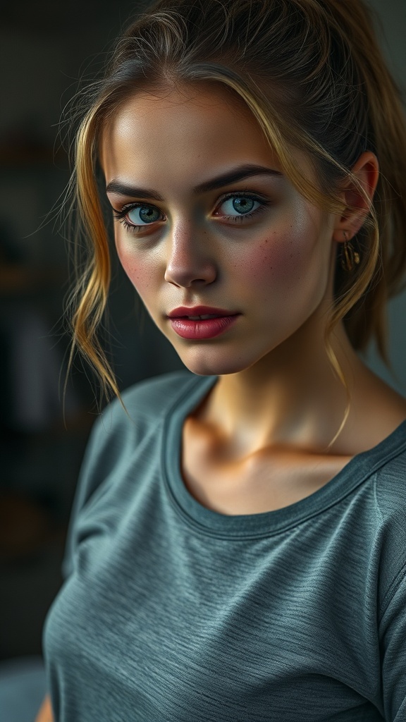 Pretty girl in a grey workout shirt, intricate details, cinematic, interior setting, detailed, muted colors, freckles, subtle imperfections, authentic, realistic portrayal, maintaining balance and proportion, natural beauty, engaging composition, focus on character and atmosphere, harmonious and cohesive imagery.