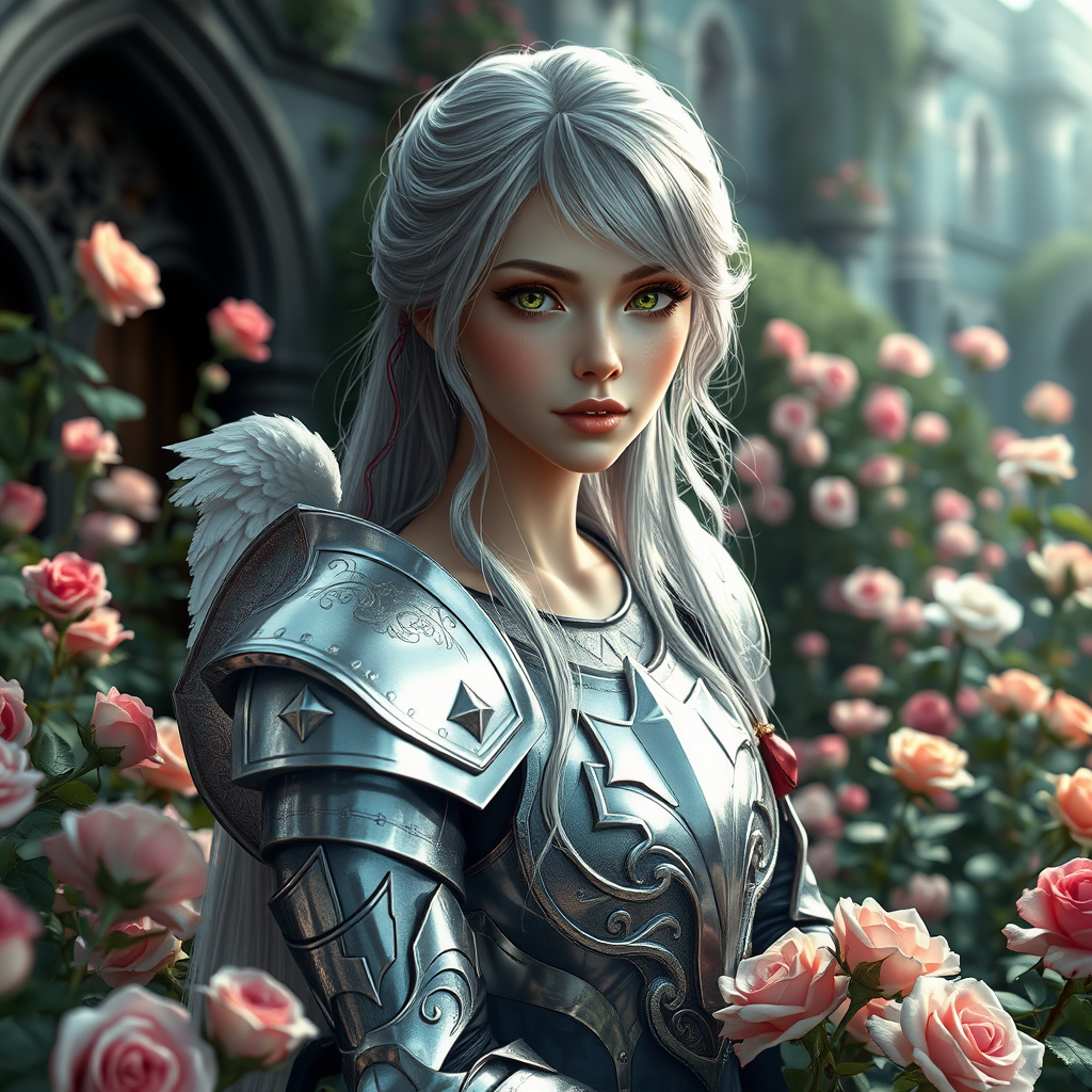 Pretty lady with an ethereal presence in a castle garden, her angelic face framed by dark silver-blonde hair and striking green eyes, adorned in shimmering silver knight armor amidst a sea of roses and flowers. The scene, evoking a sense of serenity and elegance, resembles an artwork from CGSociety or ArtStation, capturing a 3D rendering style. Despite its low-quality appearance, the piece lacks any UI, watermark, or signature, subtly hinting at the digital creation process without revealing explicit details.