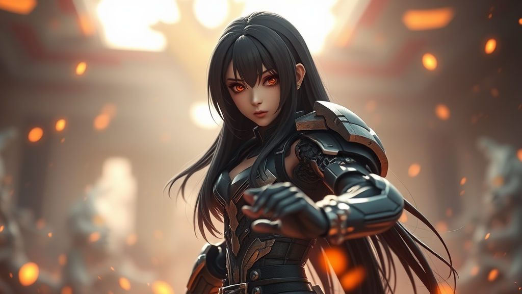 Pretty mecha girl with long black hair and an intense expression stands in a dynamic fighting stance, ready for battle amidst fire embers. Ultra high-detail and HDR capture the cinematic lighting that enhances the scene with a dramatic bokeh effect and light bloom. Utilizing concept art style, the atmosphere is enriched with photorealistic elements powered by Unreal Engine 5 and RTX technology, achieving a depth of field that draws focus to her fierce determination. Despite her missing arms and hands, the character exudes strength and resilience, creating a vivid tableau without any watermarks.