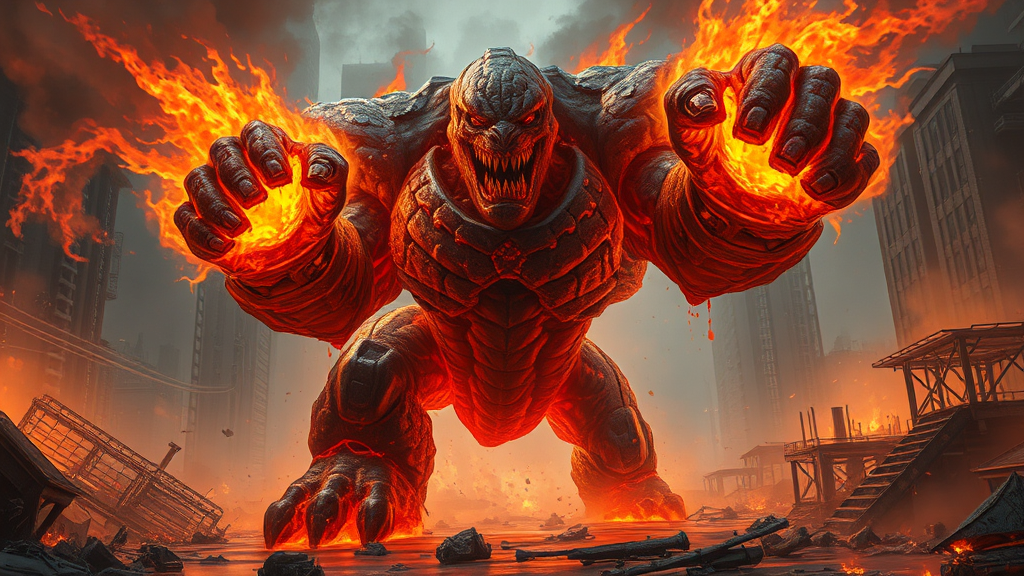 Primordial lava golem in mid-martial onslaught, its scorching fists leaving trails of thick, choking fumes. The creature's molten interior seethes through the fractures in its rugged, rocky exterior, creating a dynamic interplay of light and shadow. In a ravaged futuristic urban environment, the golem's lava interacts with the surroundings, melting steel beams, cracking pavement, and igniting remnants of advanced technology. Buildings teeter on the brink of collapse, their structures overwhelmed by waves of searing heat. Small pockets of steam rise from where molten rock meets artificial surfaces, painting a vivid picture of chaos as the golem advances in its relentless strike.