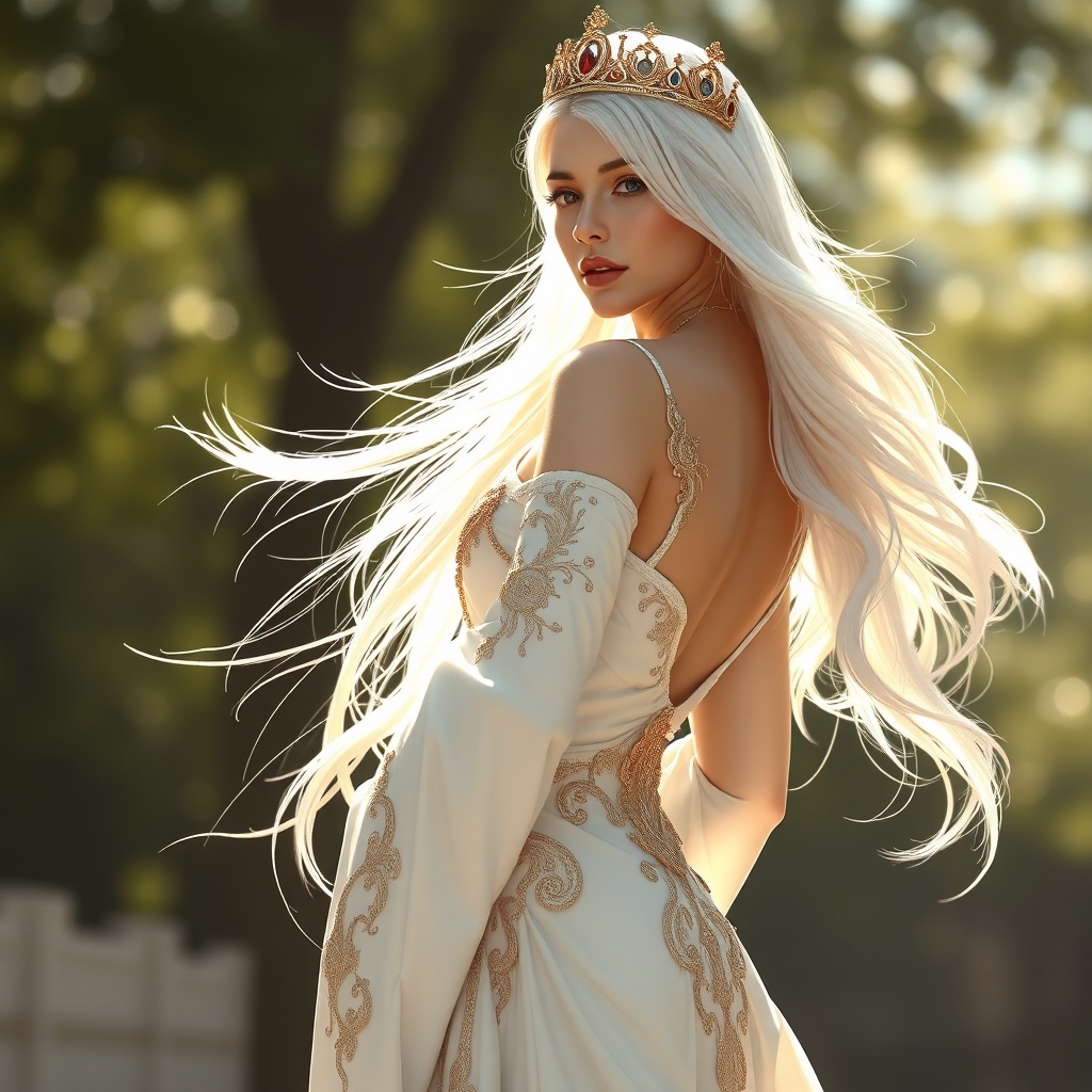 View this AI-generated image featuring a humanoid princess with flowing platinum blonde hair standing gracefully facing the viewer dressed in a luxurious white ensemble adorned with intricate gold detailing embodying elegance and sophistication depicted in a digital painting style akin to artstation