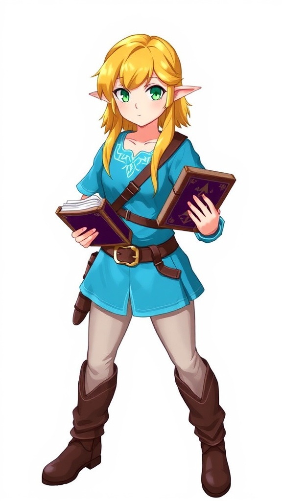 Princess Zelda, 1girl, inspired artwork, waist belt, golden blonde hair, azure shirt, holding a mysterious book, leather boots, neutral expression, full body portrait, emerald green eyes, high-resolution detail, engaging the viewer, magical aura, Nintendo character, fitted pants, iconic pointy ears, stylish shirt, short and chic hairstyle, clean background, solo focus, inspired by The Legend of Zelda series, including Breath of the Wild and Tears of the Kingdom, minimalist white backdrop with quality enhancements.