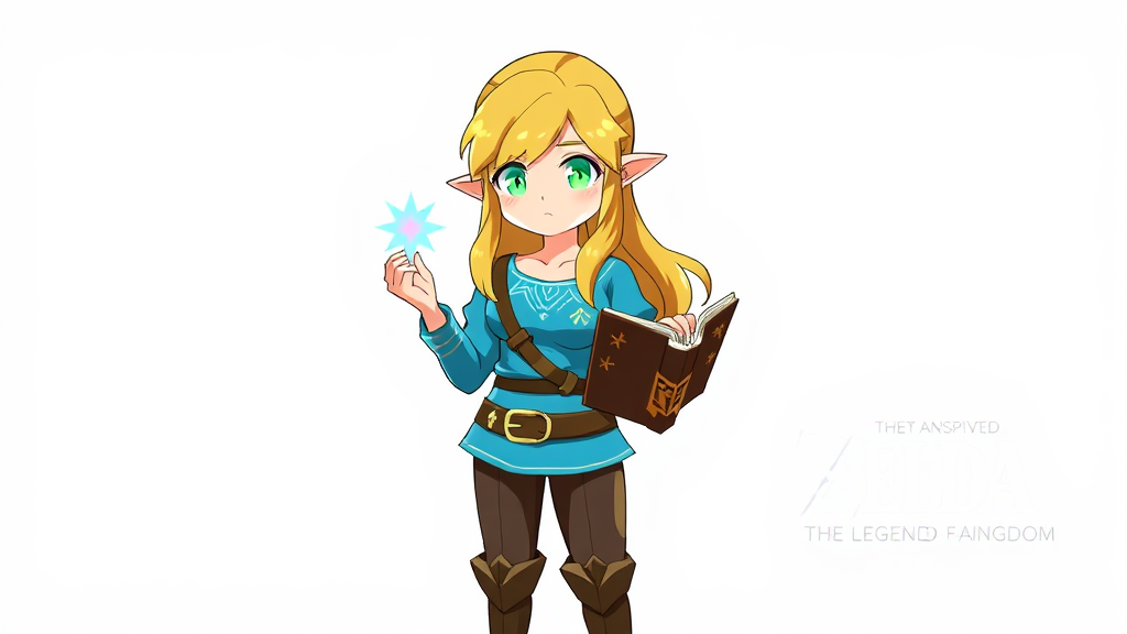 Princess Zelda, 1girl, artist inspired, belt, blonde hair, blue top, book in hand, boots, serene face, full-body pose, green eyes, high resolution, direct gaze, magic aura, Nintendo character, trousers, pointed ears, shirt, cropped hair, simple background, solo character, The Legend of Zelda universe, Breath of the Wild and Tears of the Kingdom references, luminous flower, enchanting presence, minimal text, clear image, artistic integrity, well-crafted anatomy.