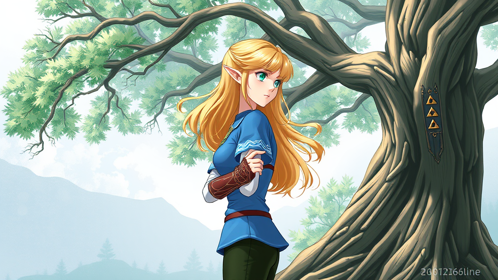 princess zelda, 1girl, bangs, blonde hair, delicate features, elegant gauntlets, serene expression, profile view, emerald eyes, high resolution, ornate jewelry, flowing hair, ornate sleeves, video game character, natural setting, hands gently clasped, elf-like ears, decorative ring, slender figure, alone, standing gracefully, the legend of zelda, majestic tree, triforce motif, half body portrait, blue blouse and dark trousers, clear and crisp image, artistic integrity, refined anatomy