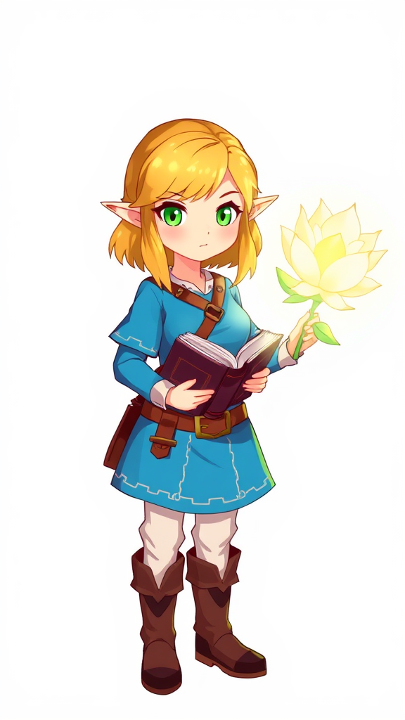 princess zelda, 1girl, blonde hair, blue tunic, holding a book, wearing boots, expressionless, full body view, captivating green eyes, high resolution, looking directly at the viewer, exuding magical aura, nintendo character, clad in pants, signature pointy ears, short hairstyle, simple backdrop, solo appearance, inspired by the legend of zelda: breath of the wild and tears of the kingdom, ethereal flower crafted from light, magic elements, no watermark or text, crisp quality without any artifacts, accurate anatomy.