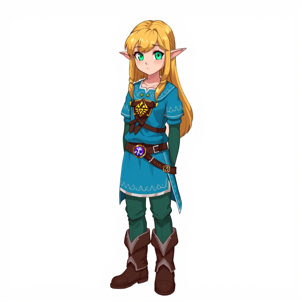 princess zelda, 1girl, fantasy-inspired, ornate belt, golden hair, azure blouse, ancient tome, sturdy boots, calm expression, full body portrait, emerald eyes, high resolution, direct gaze, mystical aura, iconic video game character, detailed pants, elven ears, blouse, bobbed hair, minimalist background, singular focus, inspired by the legend of zelda, especially breath of the wild and tears of the kingdom, plain backdrop, enhanced clarity, vivid colors, superior quality, crisp details, proportionate features.