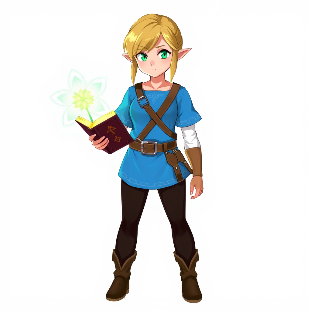 Princess Zelda, a young woman, wearing a blue top and a belt, with short blonde hair and pointy ears, gazes forward with an unreadable expression. She holds an ancient-looking book, standing confidently in brown boots and fitted pants. Her green eyes seem to glow with a touch of magic, resonating with the mystical aura of a flower made of light nearby. Set against a simple backdrop, she embodies the essence of "The Legend of Zelda," particularly reminiscent of "Breath of the Wild" and "Tears of the Kingdom." The image captures a high-resolution, solo portrayal of this iconic Nintendo character.