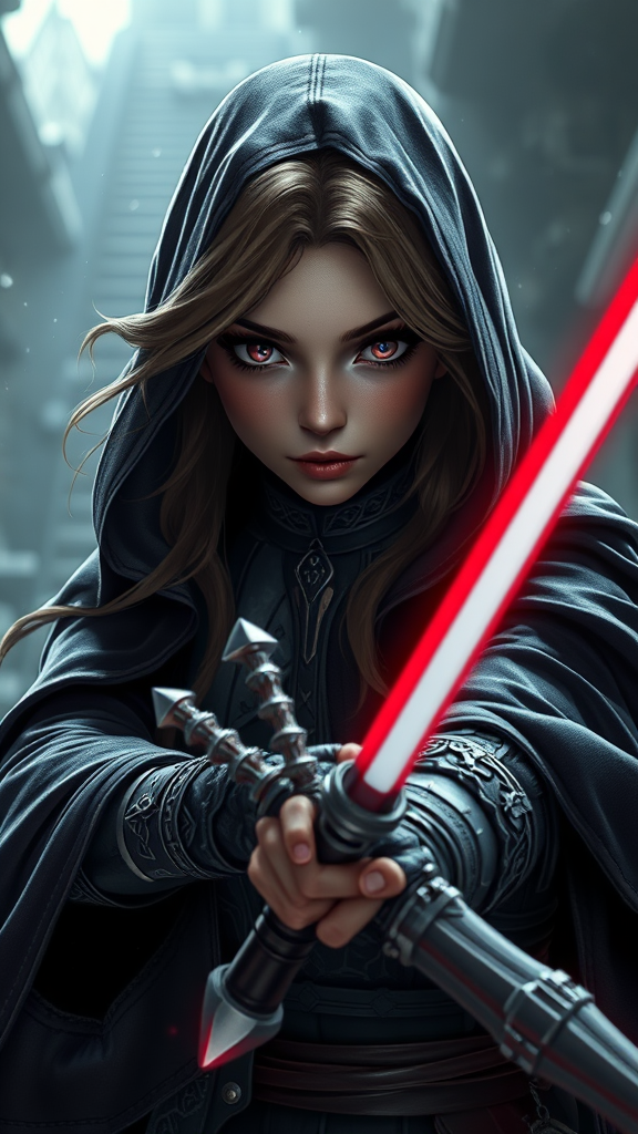 Princess Zelda as a Sith Lord from STAR WARS, dark flowing robes, perfectly symmetrical eyes, dramatic and moody lighting, set in a hyper-realistic scene, sharp focus with HD clarity, intricate detailing and lifelike textures, rendered with physics-based CGI techniques. Inspired by both anime and realistic illustration styles, the scene balances elements of photography and digital painting, capturing a dynamic action shot with exceptional realism and precision.