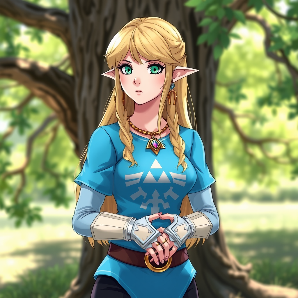 Princess Zelda, blonde hair, bangs, green eyes, expressionless, long hair, pointy ears, wearing jewelry, bridal gauntlets, blue shirt and black pants, standing outdoors near a tree, Triforce print, high resolution, Nintendo, bridal gauntlets, closed mouth, small breasts, upper body, hands together, long sleeves, ring, solo, the legend of zelda, facing sideways, natural setting, elegant attire, serene atmosphere, subtle fantasy elements.