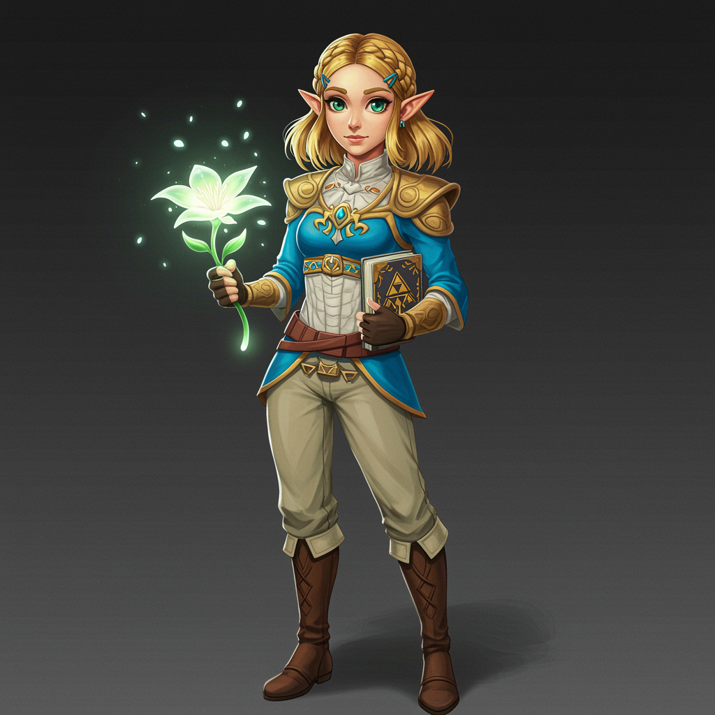 Princess Zelda, blonde hair, green eyes, pointy ears, wearing a blue top and pants, brown boots, and a belt. She is holding a book and a luminous flower made of light, suggesting magic. Her expression is calm, and she is looking directly at the viewer. The background is simple, highlighting her form in high resolution. Inspired by Nintendo's The Legend of Zelda: Breath of the Wild and Tears of the Kingdom. Her short hair adds to the modern take on her character, with an emphasis on clarity and detail, avoiding any distortions or artifacts common in low-quality images.