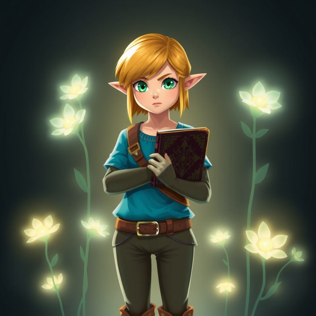 Princess Zelda, depicted as a lone figure, stands in a mystical setting. With her distinctive blonde hair and pointy ears, she embodies a regal presence, enhanced by her expressionless gaze directly meeting the viewer's eyes. She wears a finely detailed blue shirt paired with fitted pants and a practical belt, completing her adventurous ensemble with sturdy boots. Her piercing green eyes suggest wisdom, further emphasized by the ancient book she carefully holds, hinting at her vast knowledge and magical prowess. Around her, ethereal flowers crafted from light glow softly, illuminating her serene posture. The short-cropped hair frames her face, highlighting her iconic look straight from 'The Legend of Zelda: Breath of the Wild' and 'Tears of the Kingdom.' Despite the minimalist background, the focus remains on Zelda and the subtle magic in her presence, capturing her enduring legacy without the distraction of extraneous text or visual errors.
