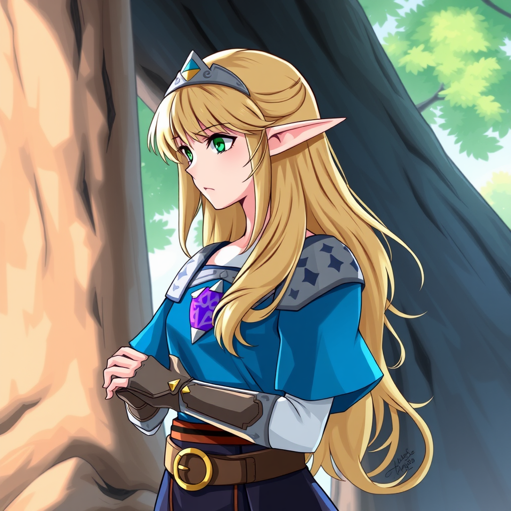 Princess Zelda, one female character, blonde hair with bangs, green eyes, expressionless face, side profile view, elegant bridal gauntlets, distinctive long ears, wearing a delicate ring, jewelry, long flowing hair, standing outdoors near a tree, wearing a blue tunic and dark trousers, Triforce symbol present, hands gently held together, high resolution, capturing the serene essence of The Legend of Zelda.