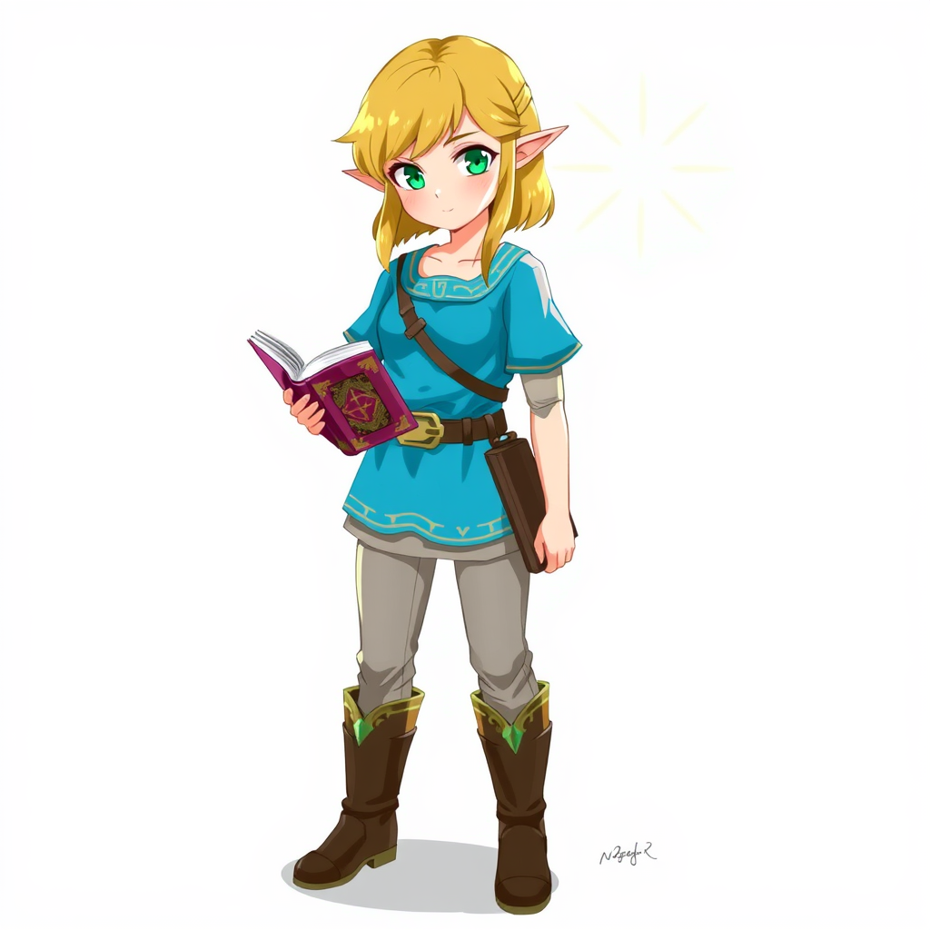 Princess Zelda, one girl, artistic depiction, belt, blonde hair, azure top, book in hand, boots, neutral expression, full body image, emerald eyes, high-resolution, gazing at viewer, enchantment aura, Nintendo character, trousers, pointed ears, blouse, short haircut, minimalistic background, solitary focus, The Legend of Zelda series, Breath of the Wild, Tears of the Kingdom, luminescent flower, mystical vibe, potential watermark or text overlay, slight blurriness, compressed image characteristics, imperfect anatomy portrayal.