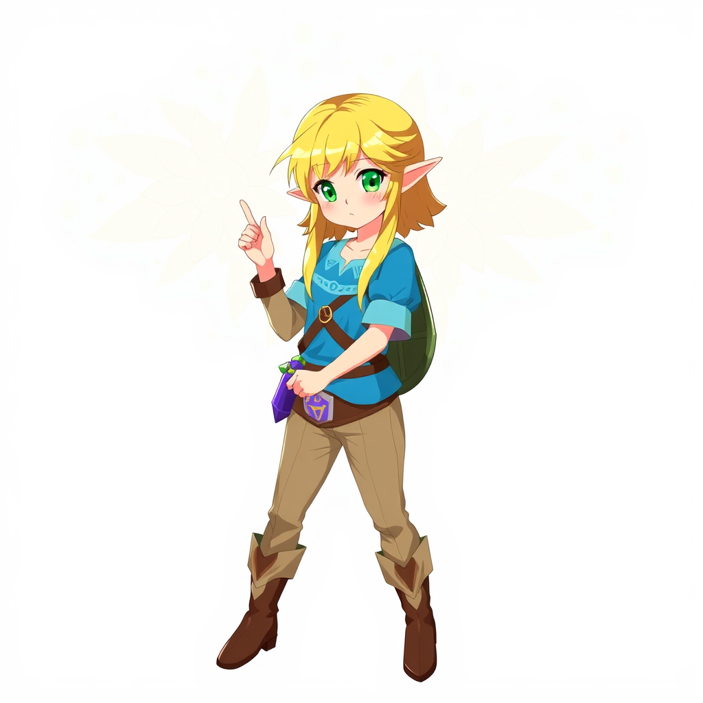 Princess Zelda, one girl, artistic depiction, waist belt, blonde hair, azure blouse, tome in hand, brown boots, neutral expression, full body pose, emerald eyes, high-resolution, direct gaze, magical aura, Nintendo theme, trousers, pointed ears, top, short haircut, minimalist backdrop, solitary figure, inspired by The Legend of Zelda series, radiant flower light, mystical, pristine quality, distinct visual, captivating, enhanced details, unique interpretation, imaginative elements, graceful proportions.