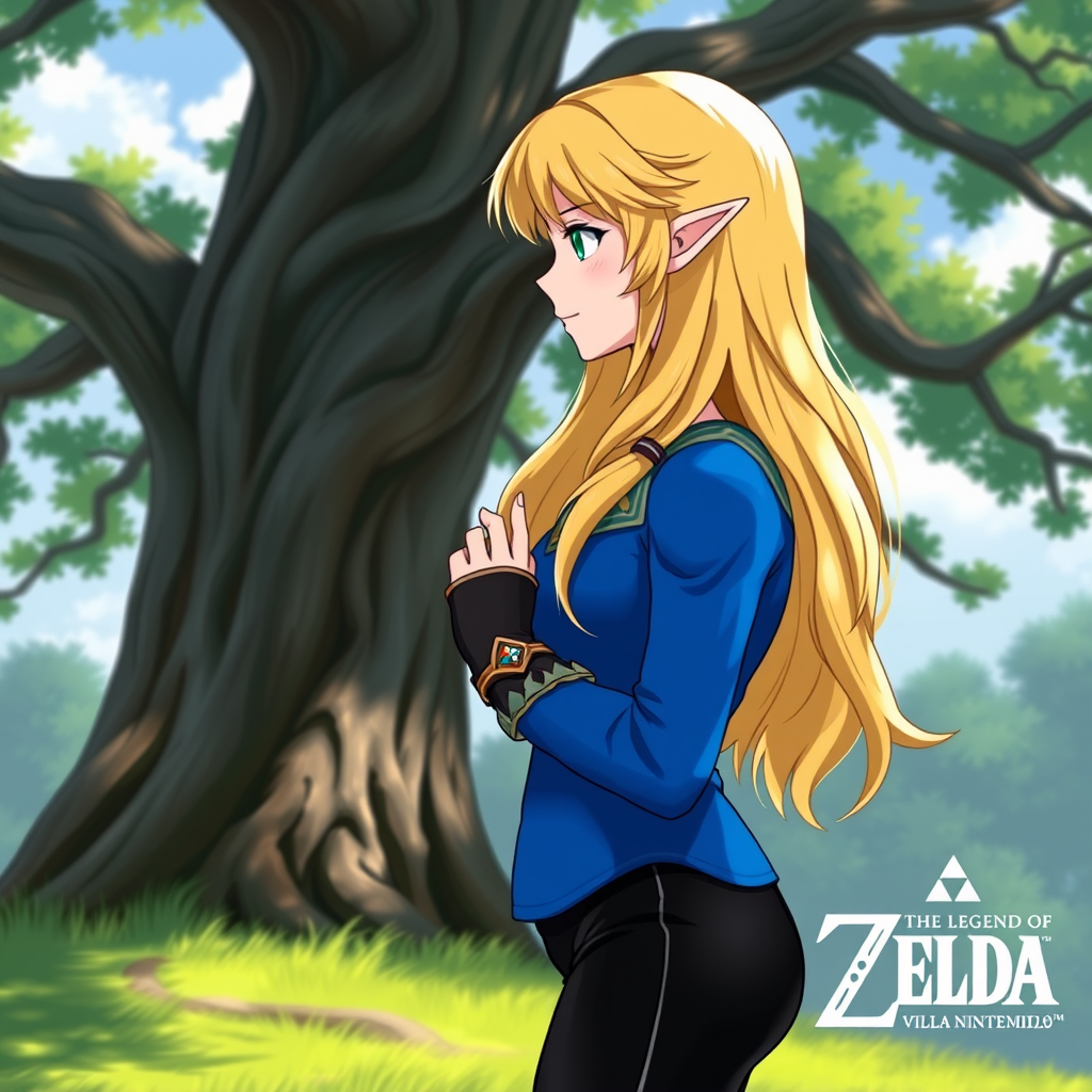Princess Zelda, one girl, bangs, blonde hair, modest figure, elegant gauntlets, serene expression, profile view, green eyes, high resolution, ornate jewelry, cascading long hair, long sleeves, Nintendo, outdoors setting, hands gently clasped, pointed ears, delicate ring, solitary presence, standing gracefully, The Legend of Zelda, near a majestic tree, Triforce symbol, upper body view, a royal blue top coupled with sleek black pants, subtle text elements, minimal imperfections, clear image, harmonious anatomy.
