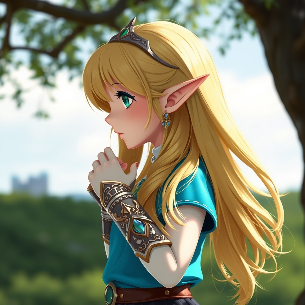 princess zelda, one girl, side profile, blonde bangs framing her face, elegant bridal gauntlets, serene expression, emerald green eyes, intricate jewelry accents, flowing long hair, dressed in iconic nintendo style, standing gracefully outdoors near a tree, hands gently clasped together, delicate pointy ears adorned with a ring, solo figure highlighting small stature, upper body focus wearing a blue shirt and black pants, hints of triforce design subtly visible, high-resolution detail capturing essence, natural setting, sense of tranquility, elements of fantasy, refined craftsmanship, mythical aura.
