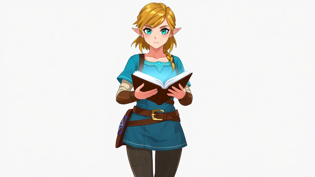 Princess Zelda, single character, artistic inspiration, waist belt, golden hair, azure shirt, open book, leather boots, neutral expression, full length, emerald eyes, high resolution, direct gaze, mystical power, iconic Nintendo character, trousers, elven ears, fitted top, cropped hairstyle, minimalist backdrop, solo focus, franchise: The Legend of Zelda, games: Breath of the Wild and Tears of the Kingdom, radiant light flower, enchanting aura, no watermark, no text or errors, clear and detailed, no artifacts or distortions, emphasis on quality, realistic proportions.
