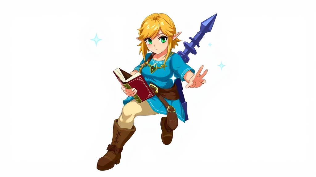 Princess Zelda, solo character, blonde hair, green eyes, short hair, pointy ears, dressed in blue shirt and belt, with pants and boots, holding a book, featuring elements of magic, expressionless gaze directed at the viewer, inspired by The Legend of Zelda: Breath of the Wild and Tears of the Kingdom, Nintendo theme, simple white background, high resolution image focusing on quality, avoiding any distortions, artifacts, or signatures, showcasing good anatomy in the full body depiction.