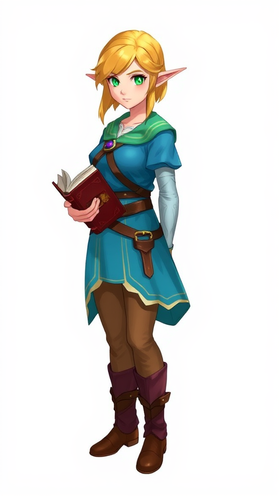 princess zelda, solo, full body, blonde hair, green eyes, pointy ears, expressionless, looking at viewer, short hair, wearing a blue tunic, brown pants, leather boots, with a worn leather belt, holding an ancient book, magic aura, from the legend of zelda series, high resolution image, simple background, white background, inspired by breath of the wild and tears of the kingdom, nintendo character, high quality details, no watermark or text, harmonious anatomy.