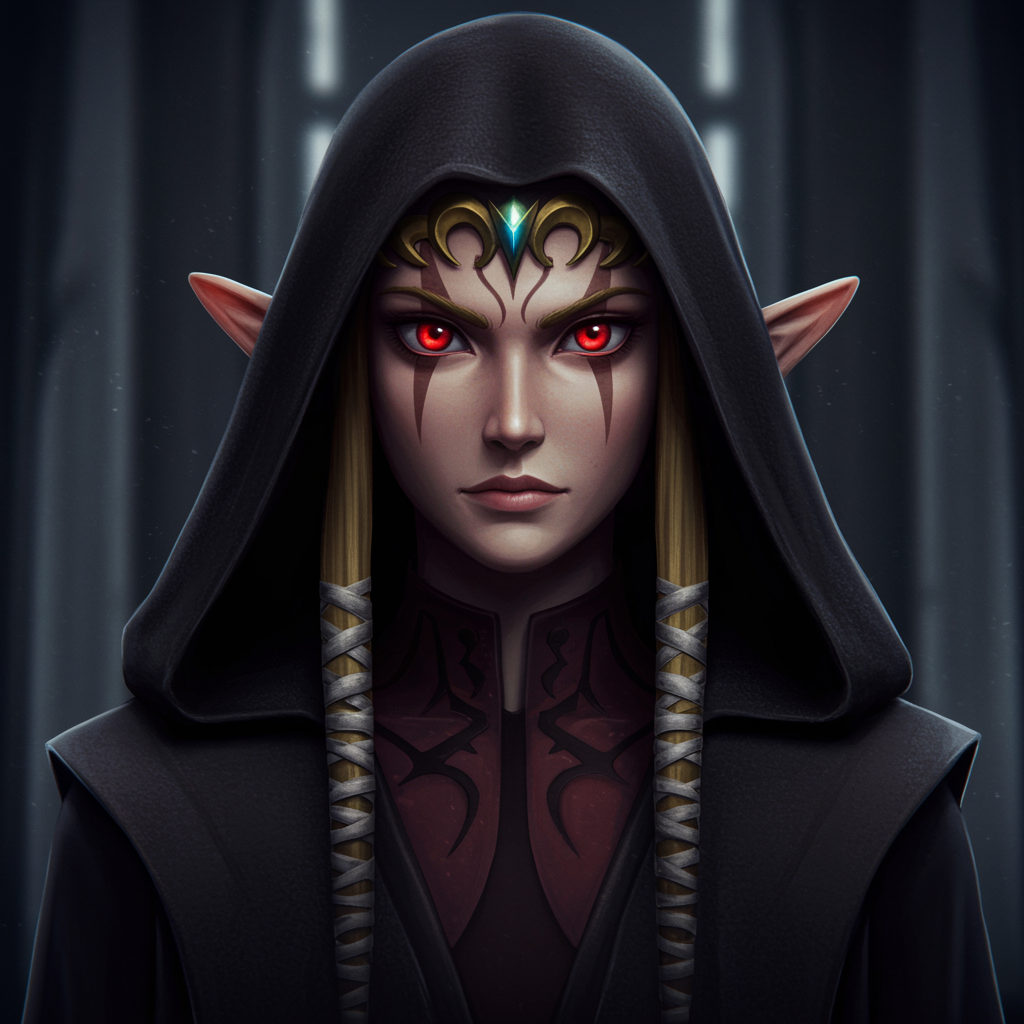 Princess Zelda transformed into a Sith lord from STAR WARS, donned in dark, flowing robes. Her eyes are intense and symmetrical, framed by dramatic lighting that casts striking shadows. The scene is captured in hyperrealistic detail, with a focus on intricate textures and sharp clarity, reminiscent of a high-definition photograph. Advanced raytracing and physics-based rendering bring a 3D quality to the image, blending elements of photography, CGI, and digital painting. Despite the anime and cartoon influences, the artwork maintains a realistic portrayal, avoiding common pitfalls of low-quality depiction, ensuring her anatomy and features are flawlessly represented without distortions or errors.