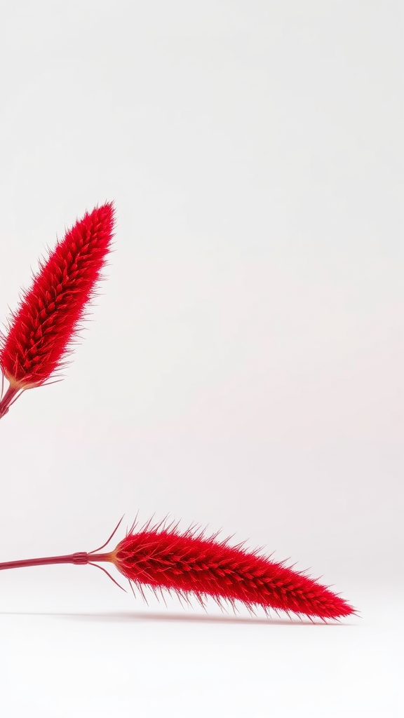Prize-winning minimalist photograph featuring crimson spikelets elegantly set against a pristine white backdrop, creatively adjusting the textures and compositions to evoke a sense of serene beauty.