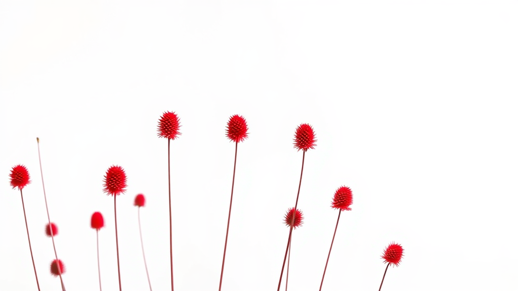 Prize-winning minimalist photograph featuring crimson spikelets on a clean, white backdrop, capturing the essence of simplicity with vibrant red hues standing out against the stark, empty space.