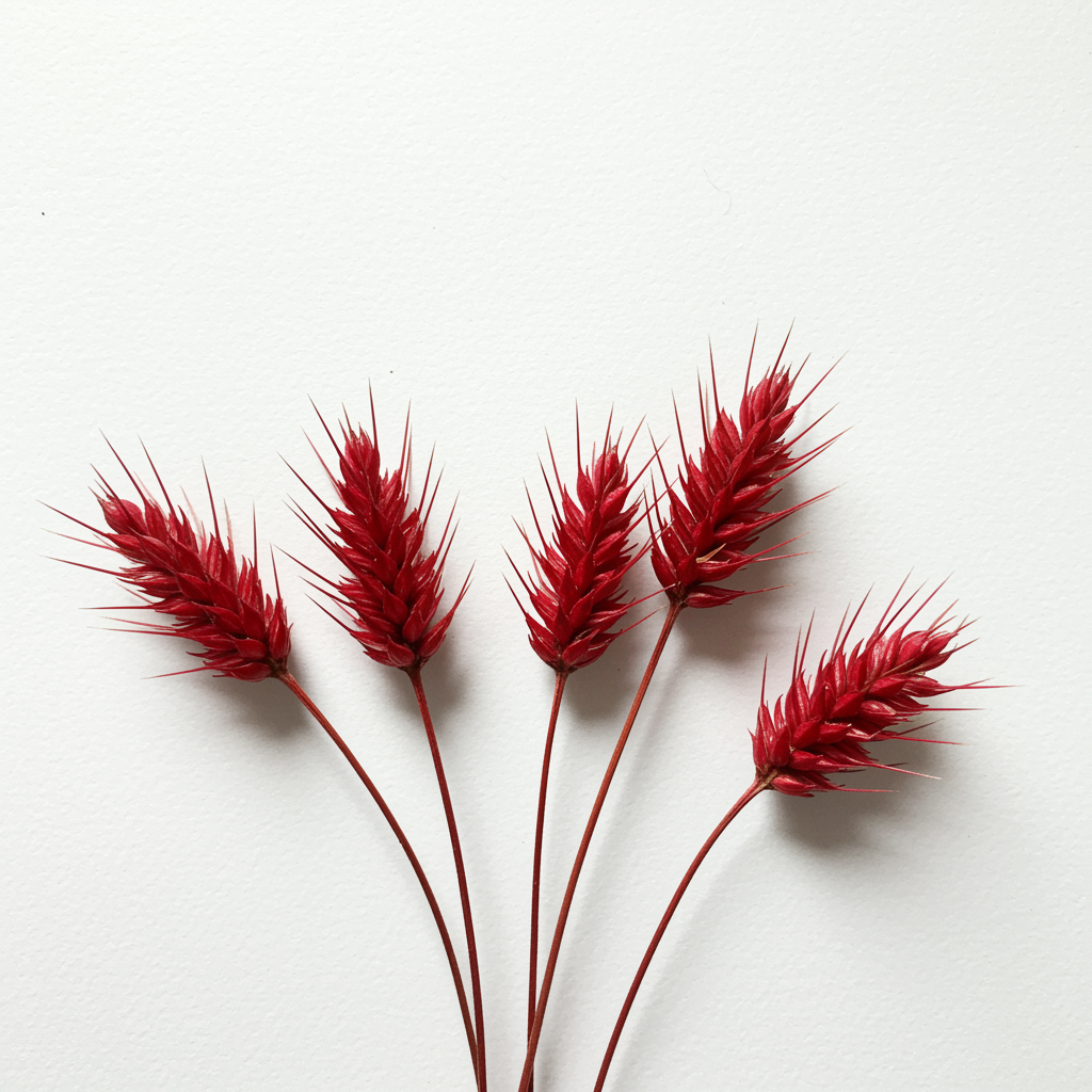Prize-winning minimalist photograph featuring crimson seed heads against a stark white backdrop, subtly enhanced with soft shadows to accentuate their striking simplicity.