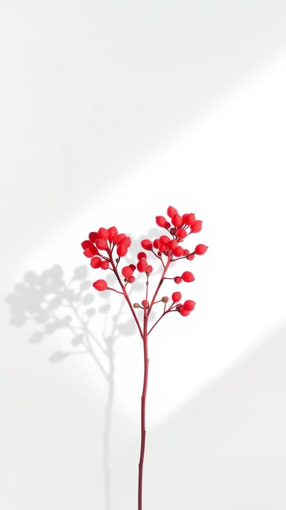 Prize-winning minimalist photograph featuring vivid crimson seed clusters set against a pristine white backdrop, subtly enhanced with delicate shadows and elegant simplicity.