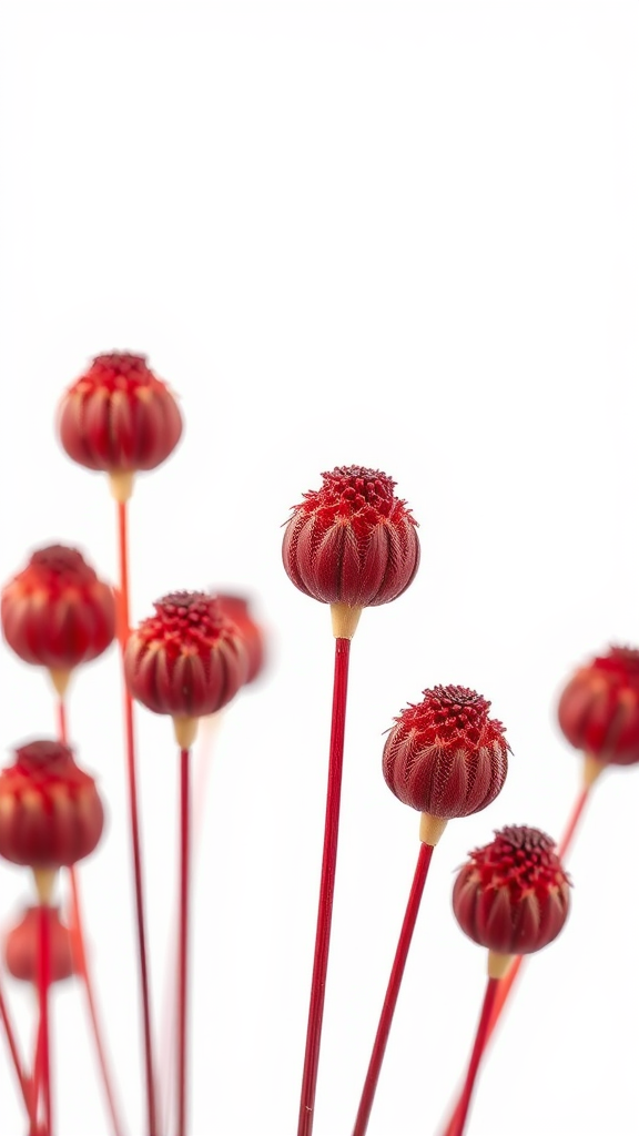 Prize-winning minimalist photography featuring crimson seed heads set against a stark white backdrop, with subtle creative enhancements to emphasize texture and contrast.