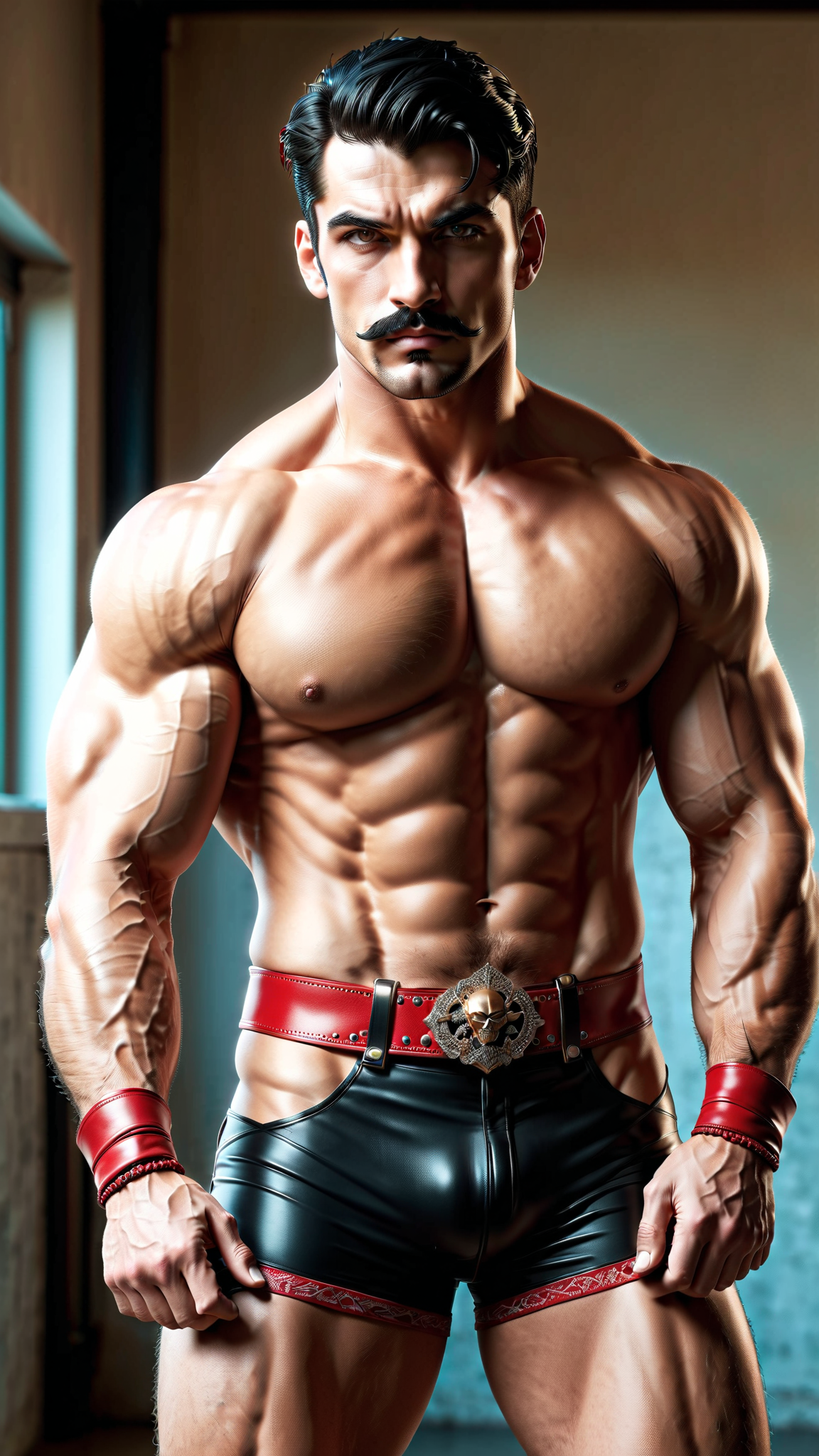 Pro Wrestler, Gypsy male, bodybuilder, big muscled. olive skin, hirsute body, Sparkling pale hazel eyes. Hypermasculine. Strong brow, chiseled jaw, handsome model young face, SHORT jet-black hair, Scarlet red bandana tied around forehead, well-trimmed thin black mustache and soulpatch on face. Broad chest, wide back and shoulders, narrow waist. Extreme hirsute hairy chest, hair on torso and arms. Strong brawny muscular sinewy body, shirtless, extreme armpit hair, black leather boots, Scarlet red sash belt, Scarlet red rangers tights, black leather bracers on arms, full body pose
