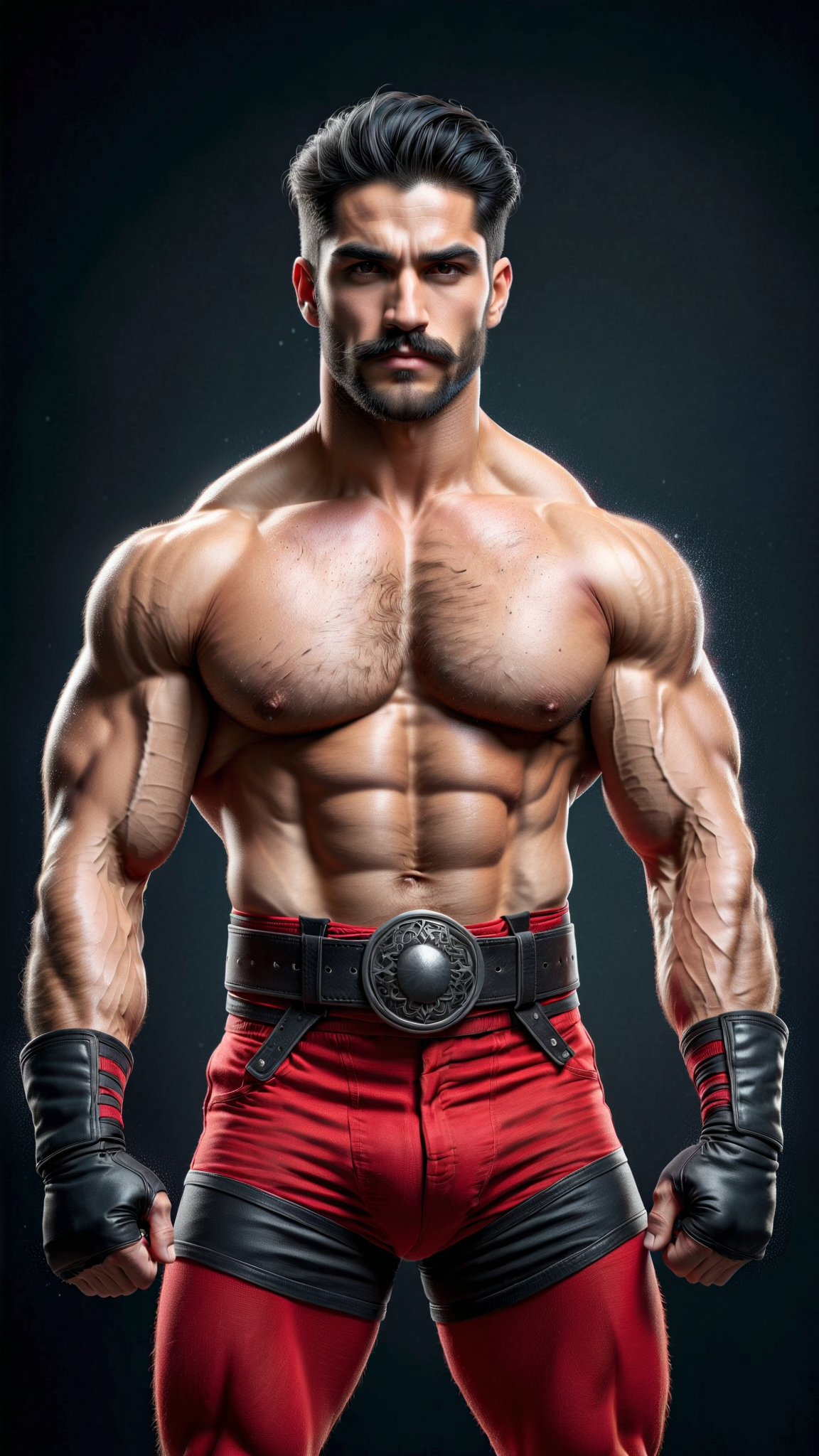 Pro Wrestler, Gypsy male, bodybuilder, big muscled. olive skin, hirsute body, Sparkling pale hazel eyes. Hypermasculine. Strong brow, chiseled jaw, handsome model young face, SHORT jet-black hair, Scarlet red bandana tied around forehead, well-trimmed thin black mustache and soulpatch on face. Broad chest, wide back and shoulders, narrow waist. Extreme hirsute hairy chest, hair on torso and arms. Strong brawny muscular sinewy body, shirtless, extreme armpit hair, black leather boots, Scarlet red sash belt, Scarlet red rangers tights, black leather bracers on arms, full body pose