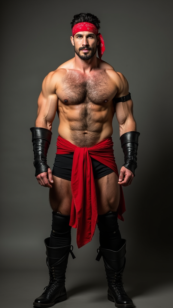 Pro Wrestler, Gypsy male, bodybuilder, big muscled. olive skin, hirsute body, Sparkling pale hazel eyes. Hypermasculine. Strong brow, chiseled jaw, handsome model young face, SHORT jet-black hair, Scarlet red bandana headband tied around forehead, well-trimmed thin black mustache and soulpatch on face. Broad chest, wide back and shoulders, narrow waist. Extreme hirsute hairy chest, hair on torso and arms. Strong brawny muscular sinewy body, shirtless, extreme armpit hair, black leather boots, Scarlet red sash belt, Scarlet red rangers tights, black leather bracers on arms, full body pose