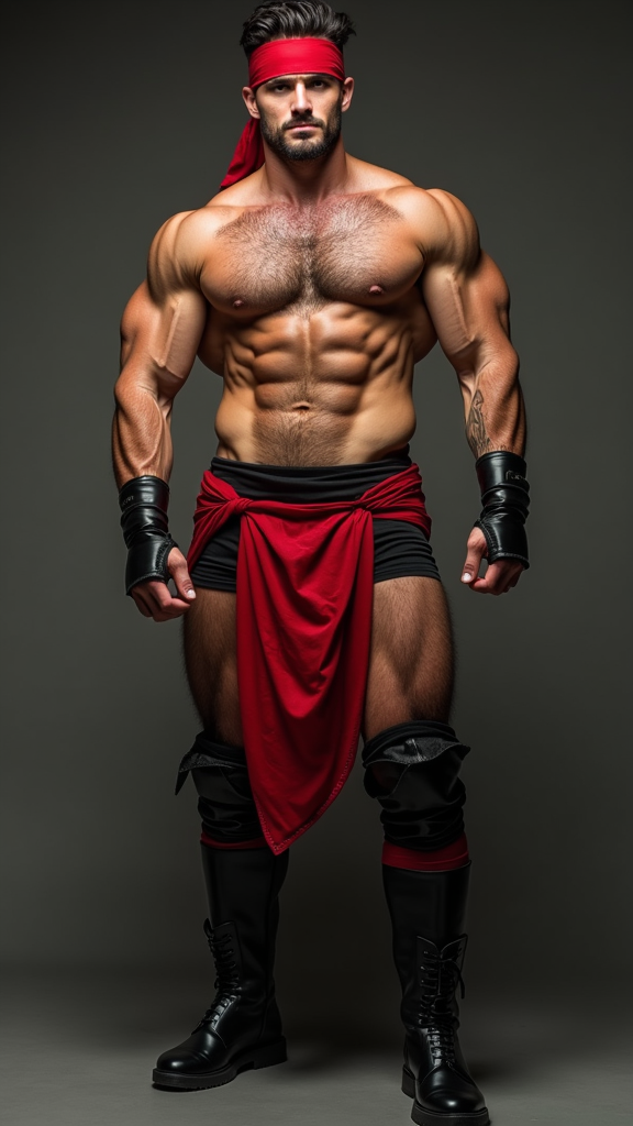 Pro Wrestler, Gypsy male, bodybuilder, big muscled. olive skin, hirsute body, Sparkling pale hazel eyes. Hypermasculine. Strong brow, chiseled jaw, handsome model young face, SHORT jet-black hair, Scarlet red bandana headband tied around forehead, well-trimmed thin black mustache and soulpatch on face. Broad chest, wide back and shoulders, narrow waist. Extreme hirsute hairy chest, hair on torso and arms. Strong brawny muscular sinewy body, shirtless, extreme armpit hair, black leather boots, Scarlet red sash belt, Scarlet red rangers tights, black leather bracers on arms, full body pose