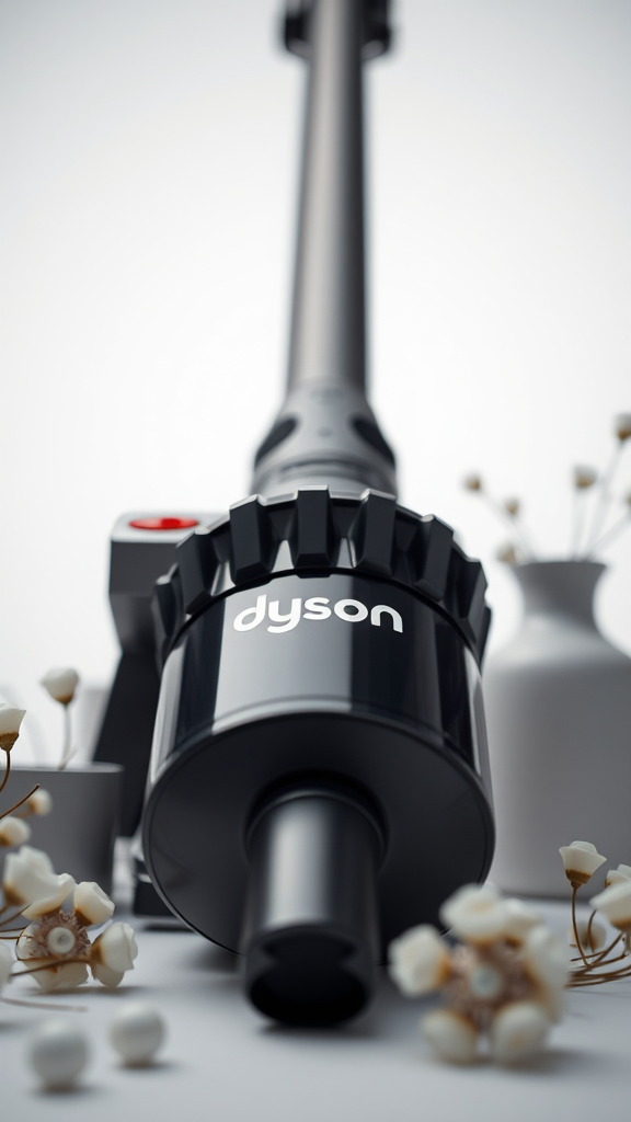 Product close-up, Dyson, clear studio background, captured with a 100mm lens, featuring bright noon-like studio lighting, complemented by simple, elegant objects surrounding the scene.