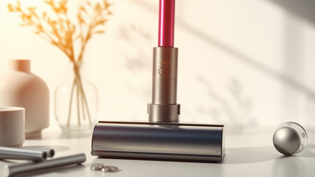Product close-up, Dyson-inspired, captured in a bright studio setting with a 90mm lens, featuring a crisp afternoon light, surrounded by minimalistic objects with subtle creative flair.