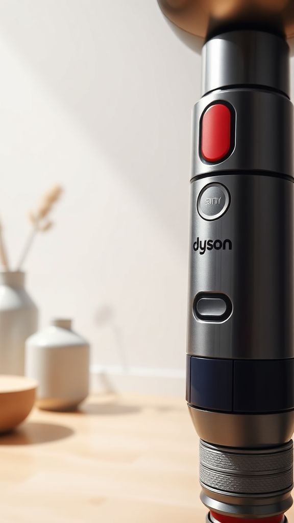 Product close-up, Dyson, studio backdrop, captured with a 105mm lens, illuminated by soft afternoon studio lighting, featuring minimalist objects in the background.