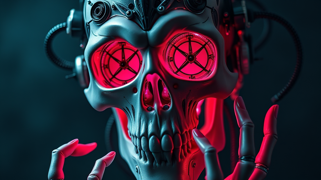 Product shot, a skull infused with mechanical elements and vibrant pink luminescent liquid flowing from the eye sockets, sharp focus, extreme detail, moody illumination, intricately detailed, ornate filigree design, captured in 8k, UHD, HDR. Model: Vinteprotogenmix V20, features duplicated, altered, with cloned facial aspects, cross-eyed expression, lengthened neck, additional fingers, and uniquely formed hands, maintaining the overall theme. The composition avoids low resolution, out-of-frame elements, blur, jpeg artifacts, watermarks, logos, text, usernames, words, cropped sections, and a cartoonish appearance, ensuring a seamless and immersive visual representation.