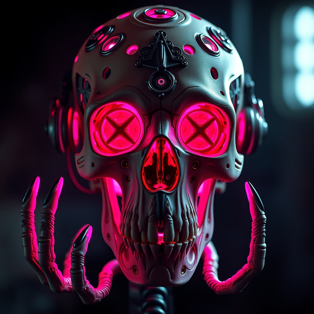 Product Shot of a skull embedded with mechanical components, emitting a vibrant pink luminescent fluid from the eyes, captured in sharp focus with extreme detail and a touch of gloomy illumination. Featuring very intricate and ornate filigree, presented in 8k UHD and HDR, inspired by the Vinteprotogenmix V20 model. The scene explores themes of duplication and mutation, with a cloned visage showcasing cross-eyed features, an elongated neck, and extra fingers on mutated hands, maintaining a cohesive appearance without introducing low-resolution elements. The composition is kept free of any out-of-frame distractions, blurriness, jpeg artifacts, watermarks, logos, letters, usernames, words, or cropped images, avoiding cartoonish or split image characteristics.