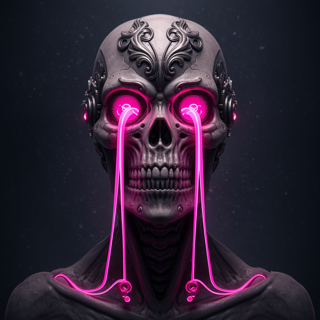 Product shot of a skull with mechanical components and pink luminescent fluid flowing from the eye sockets, featuring sharp focus and extreme detail in a gloomy illumination. The design is highly intricate with ornate filigree, captured in 8k UHD HDR quality. The model appears as Vinteprotogenmix V20, showcasing elements of duplication and mutation with a cloned face, cross-eyed expression, elongated neck, and extra fingers on mutated hands. The scene is free of low resolution, out-of-frame elements, blur, jpeg artifacts, watermarks, logos, text, and split images, maintaining a clear and cohesive visual theme.