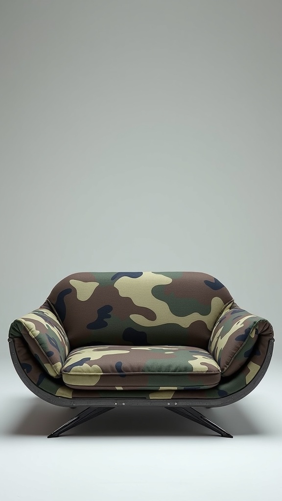 View this AI-generated image featuring productive photography front view featuring a compact couch with an innovative design adorned in camouflage texture accented by sleek steel details captured using a sony 7r iv paired with a sony fe 24 70mm f 2 8 gm lens set to an aperture of f 8 for exceptional
