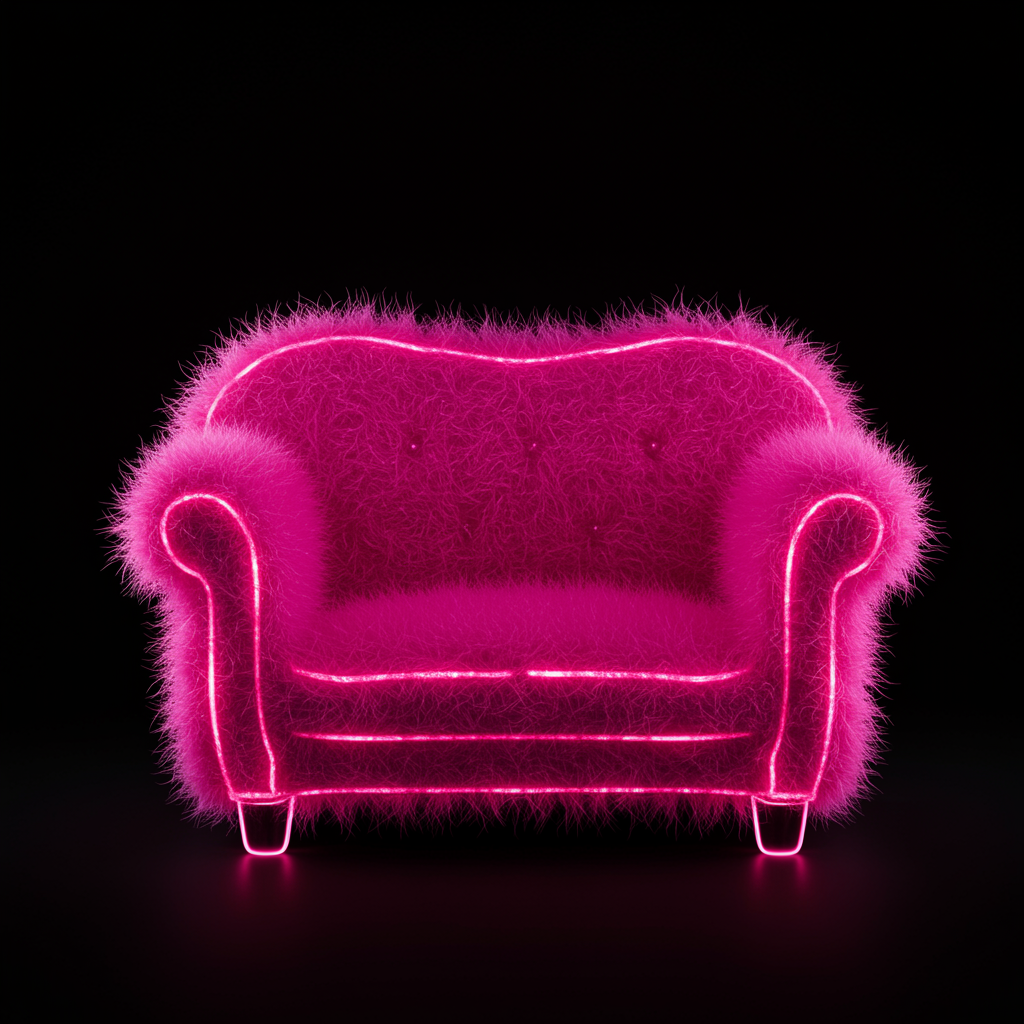 Productive photography front view of a small fluffy couch made from transparent fluorescent magenta vinyl material, featuring intricate details and illuminated by indirect lighting. The creative and innovative design is captured using a Sony α7R IV with a Sony FE 24-70mm f/2.8 GM lens, set to an aperture of f/8 for optimal sharpness and a shutter speed of 1/125 to freeze the scene, maintaining an ISO of 100 for the best image quality. The composition emphasizes high contrast with outstanding highlights against a solid black background, highlighting every detail from the light patterns to the material textures. The image is shot in a glamourous UHD resolution with a sharp focus and clear, detailed presentation, set in a solid black atmosphere with a dark background. The emphasis on indirect lighting creates a striking visual with a sophisticated glow, maintaining a raw style with a stylized touch, ensuring a seamless and uninterrupted visual narrative without cropping, while avoiding fur and strange shadows.