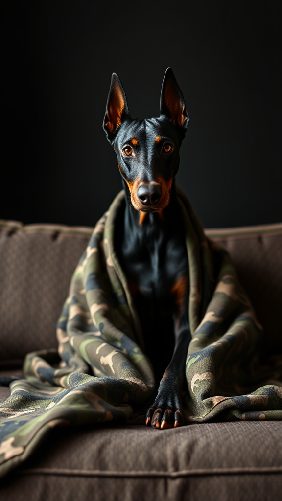 Productive photography in a minimalist photo studio setting, front view of a dark scheme camouflage texture sofa with a camouflage pattern blanket draped over it. A blanketed black Doberman sits on the sofa, its intense gaze fixed on the camera. The focus is on the intricate details of the blanket, with depth of field enhancing the realism. Dusk sunlight casts soft highlights across the scene, capturing the ultra-realistic essence in UHD resolution, evoking a raw and stylized aesthetic.