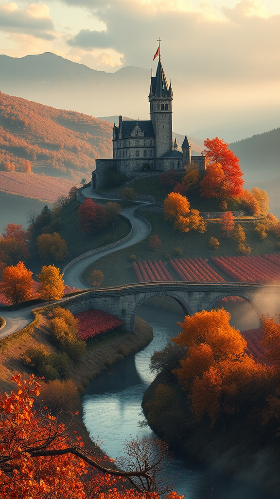 Professional concept art image of a medieval castle perched atop a hill, surrounded by sprawling vineyards and a meandering river crossed by an ancient stone bridge. The scene is bathed in the warm hues of autumn, with trees displaying vibrant reds and golds as dawn's first light casts a soft, enchanting glow over the landscape. The composition boasts ultra-detailed high resolution, capturing every intricate feature in stunning 8K quality. The image evokes a sense of timeless beauty, with a 35mm lens effect highlighting the subtle textures and colors. The atmosphere is serene, with gentle mists adding to the ethereal ambiance, while ensuring the artwork remains clear and free of any deformed or disfigured elements, maintaining pristine quality without low resolution or JPEG artifacts, trending on artstation.