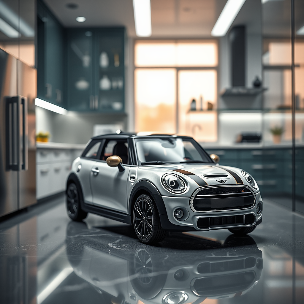 Professional Grade HDR miniature scale photography of a futuristic Mini Cooper installed in a modern glass kitchen, capturing the nuanced details of its sleek design in 8K resolution, featuring soft, even lighting with zero contrast, precise sharp focus, and an intimately cleaned up perspective, imbued with the aesthetic of high-end film photography, emphasizing the dramatized highlights of the HDR setting, rendered with 8K octane rendering engine, HDR brightness in a deliberately styled environment with absolutely no shadows, impeccable high-resolution, fine detailed photorealistic texture of the miniature car's bespoke design, imagined studio-style stock photography composition, legitimate ar 3:2 aspect ratio