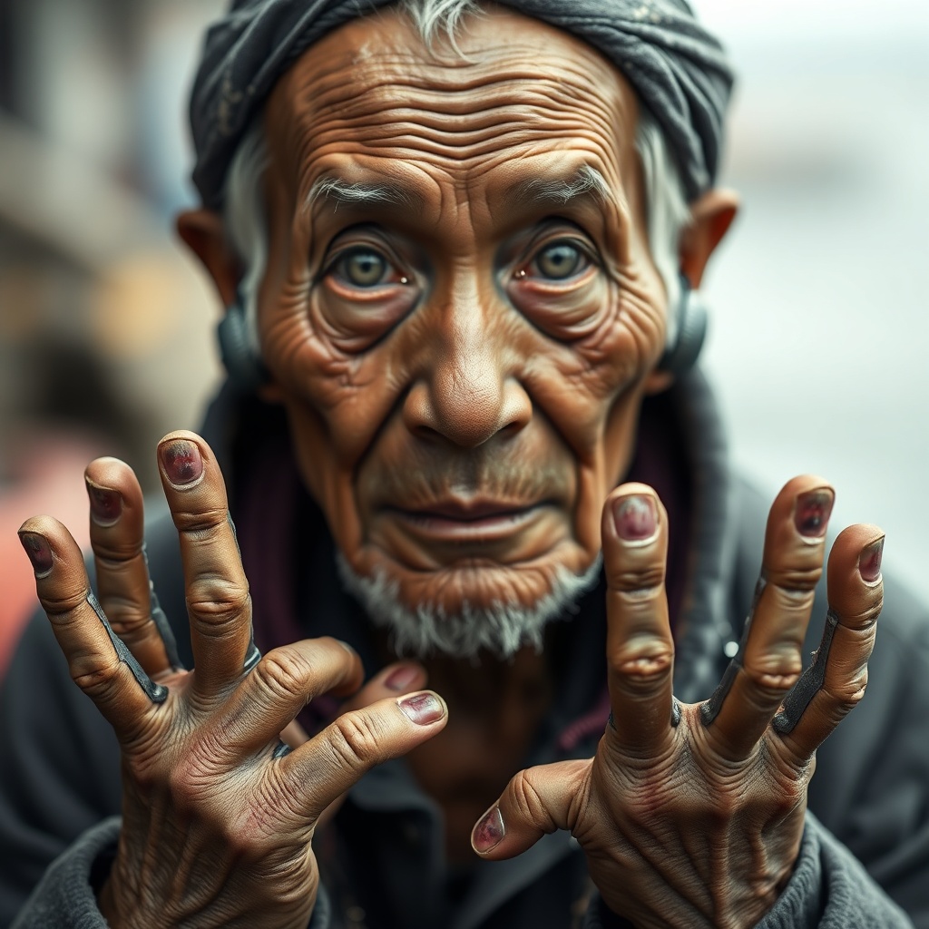 Professional medium-shot portrait of an elderly fisherman, approximately 50 years old, captured with a Nikon Z9 using a 100mm lens at f/1.8. The fisherman has unique robot-like eyes and exhibits unusual anatomical features, including extra limbs and fingers, portrayed in a slightly blurry and desaturated style. His hands and feet appear whimsically distorted, suggesting a dreamlike or surreal quality. The composition has hints of artistic tiling and mutation, emphasizing a blend of traditional and futuristic elements. The image takes on a 3D effect, where the beauty lies in its unconventional and imaginative representation.