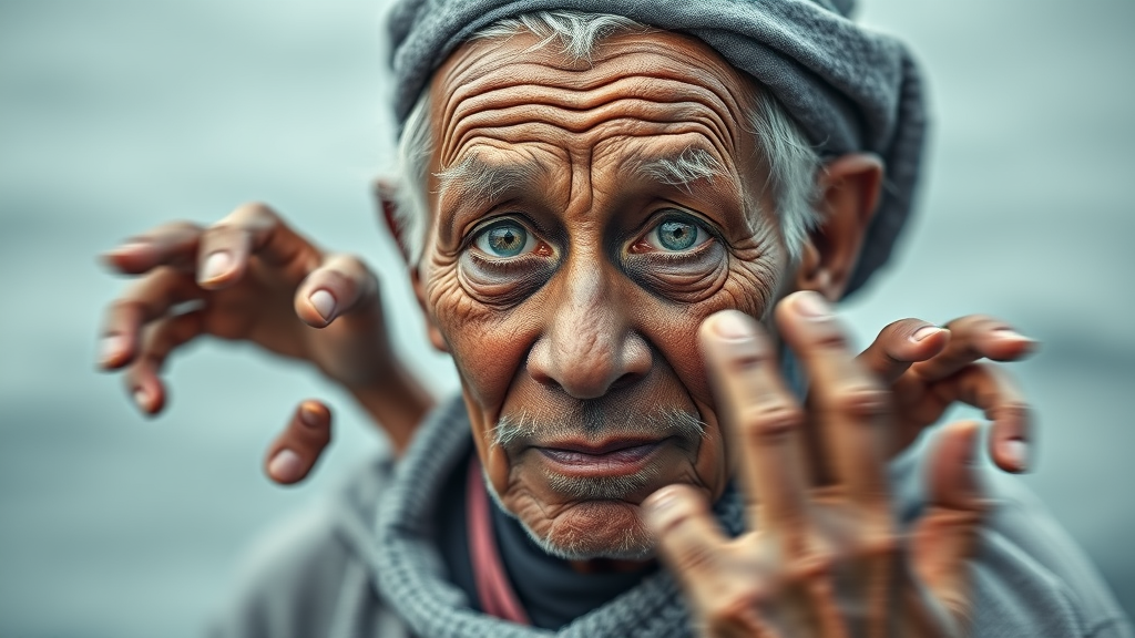 Professional medium-shot portrait of an elderly fisherman, approximately 50 years old, taken with a Nikon Z9 at f/1.8 and 100mm. The subject has striking, unusual eyes that resemble those of a robot, and exhibits peculiar anatomical features. The portrait has a surreal quality, with extra limbs and distorted features such as additional fingers and poorly defined hands and feet. The image is intentionally blurry and out-of-focus in areas, giving a fuzzy impression, with some elements appearing slightly out of frame or haphazardly tiled. The overall composition has a unique, otherworldly feel with a mix of deformed and mutated details, making it an abstract interpretation of a classic portrait. The colors are subdued, lending a desaturated and almost monochromatic appearance to the scene, emphasizing its artistic, distorted nature.